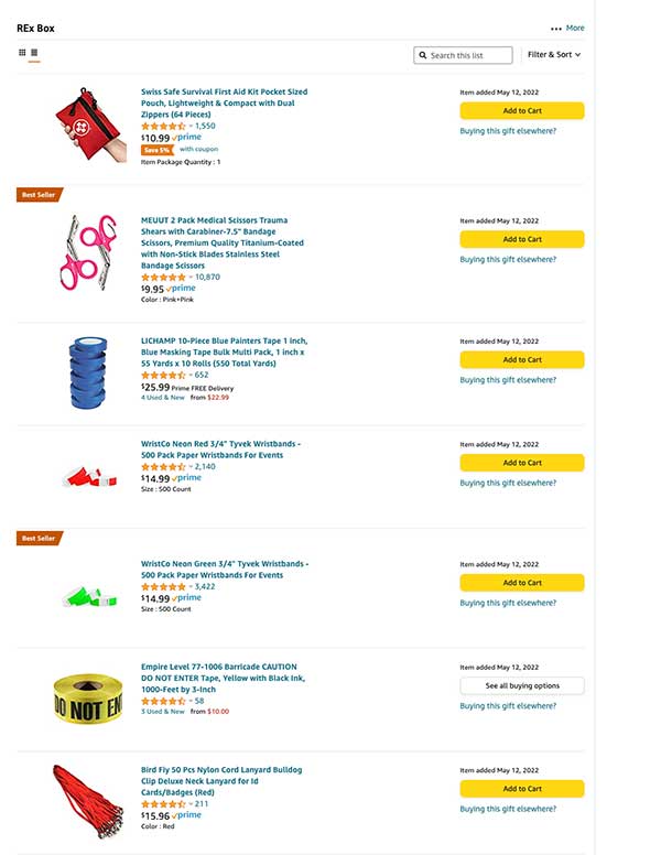 Itemized list of everything included in the REx Box. There are enough materials in the box for a couple of additional exercises beyond the REx training.
