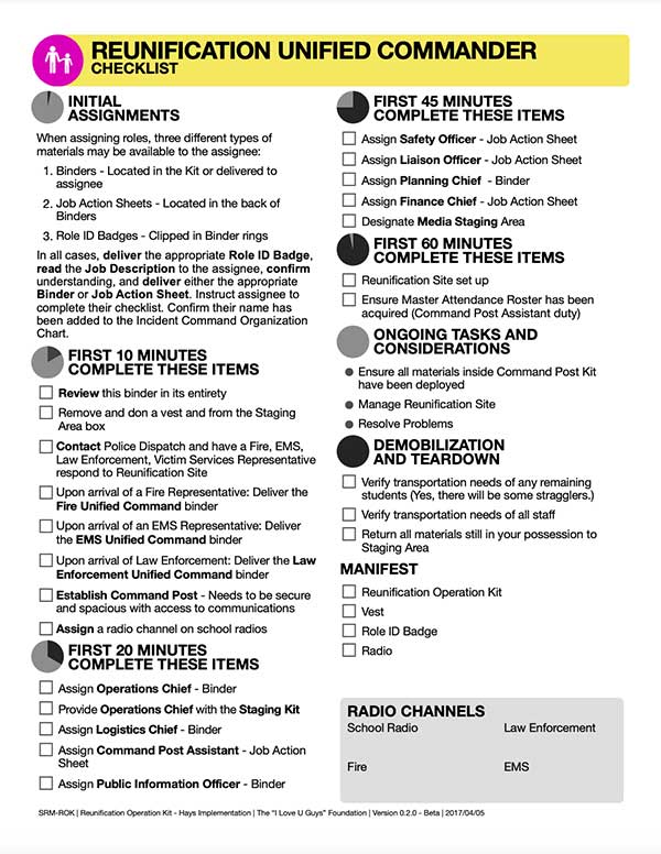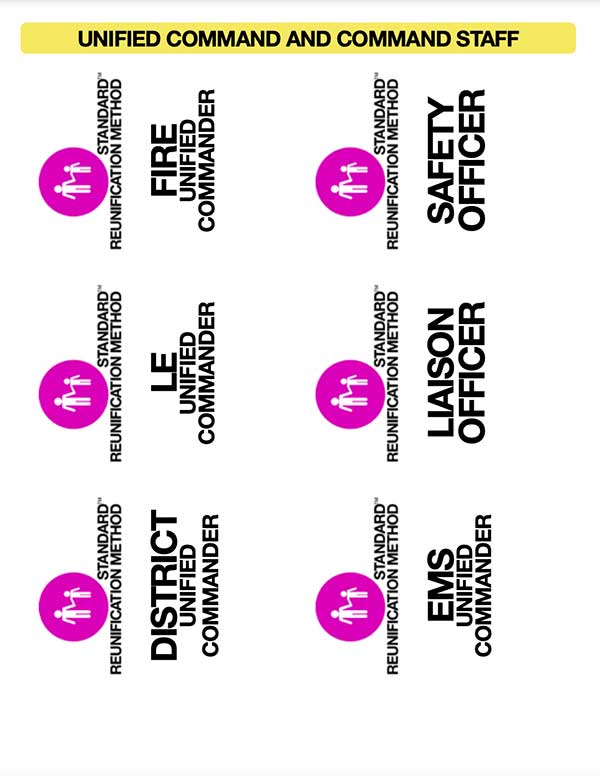 Standard Reunification Method Role ID Badges for all roles involved in the process. Badges include a brief description of the duties that belong to the role.